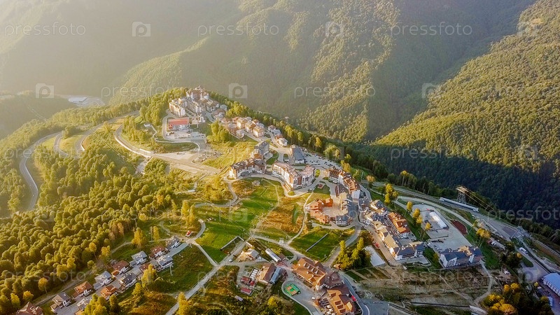 Плато Роза Хутор, постройки, склоны и кресельные подъемники. Вид с воздуха на закате