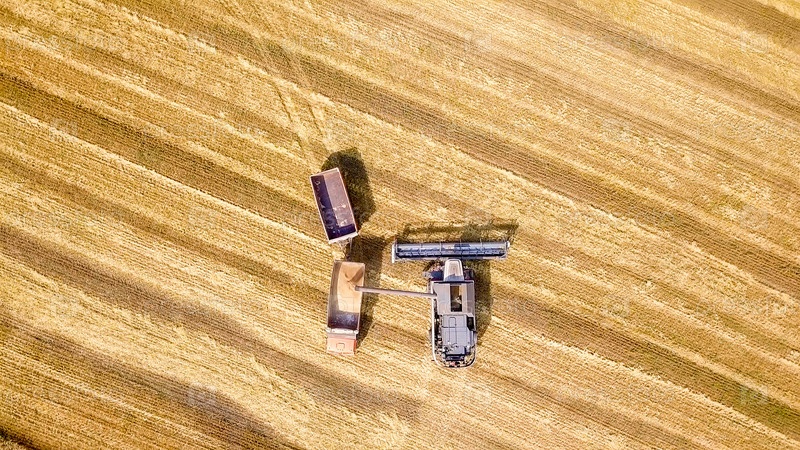 Зерноуборочный комбайн собирает урожай пшеницы на поле. Погрузка в грузовик с прицепом