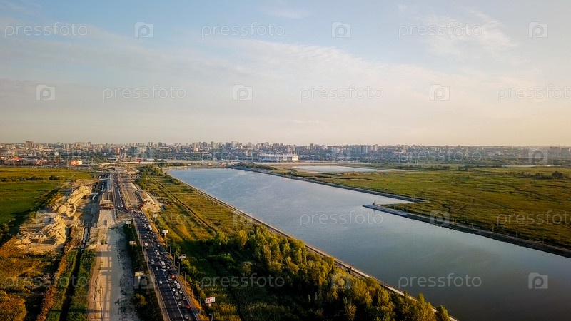 Панорама центральной части Ростова-на-Дону. Стадион, река Дон. Россия, Ростов-на-Дону