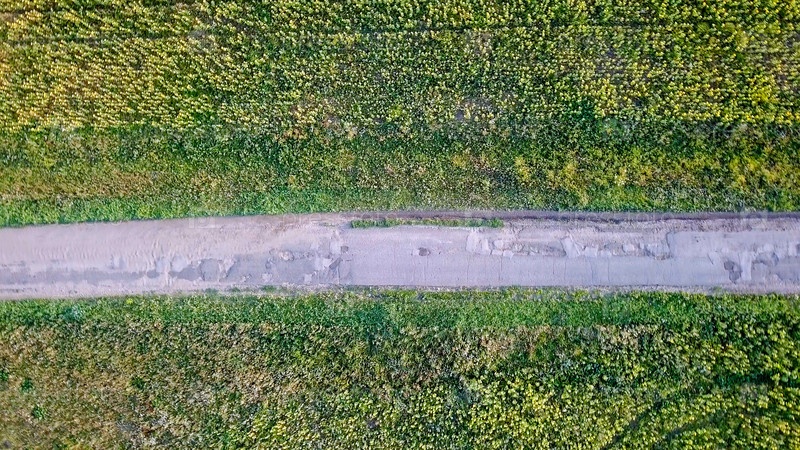 Полет над дорогой, проходящей через поля подсолнухов. Россия