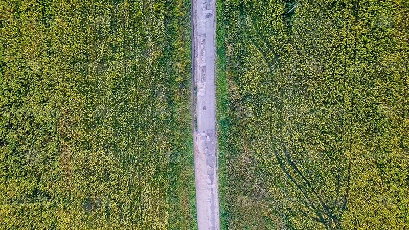 Полет над дорогой, проходящей через поля подсолнухов. Россия