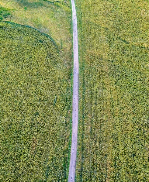 Полет над дорогой, проходящей через поля подсолнухов. Россия