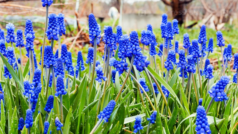 Голубые цветы мускари на зеленом фоне