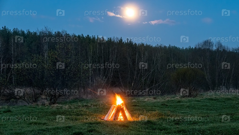 Костер в поле на фоне луны
