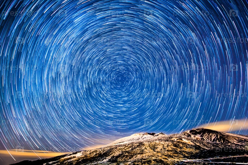 Звезды оставляют затухающие следы. Гора Этна, Италия