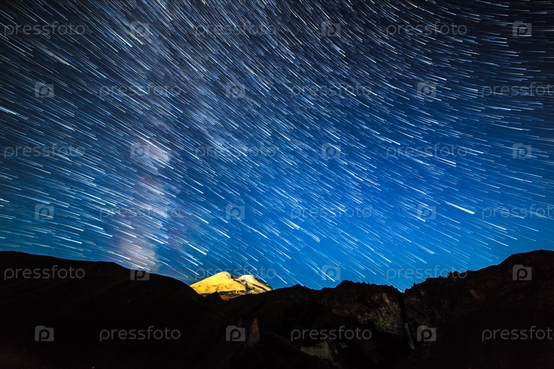 Звезды рисуют угасающие линии и облака над Эльбрусом. Ночной пейзаж. Россия