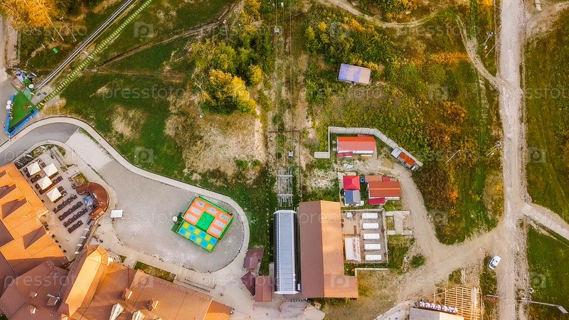 Плато Роза Хутор, постройки, склоны и кресельные подъемники. Вид с воздуха на закате