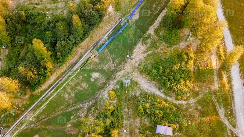 Плато Роза Хутор, постройки, склоны и кресельные подъемники. Вид с воздуха на закате