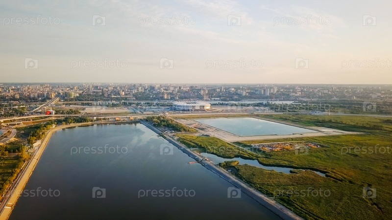 Панорама центральной части Ростова-на-Дону. Стадион, река Дон. Россия, Ростов-на-Дону