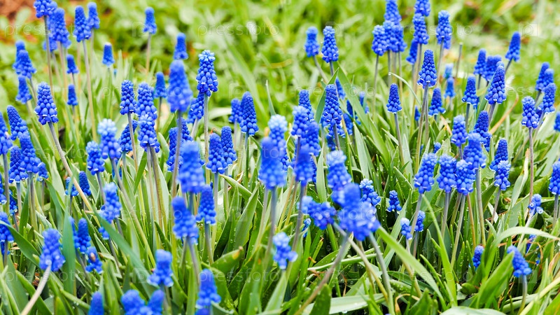 Голубые цветы мускари на зеленом фоне