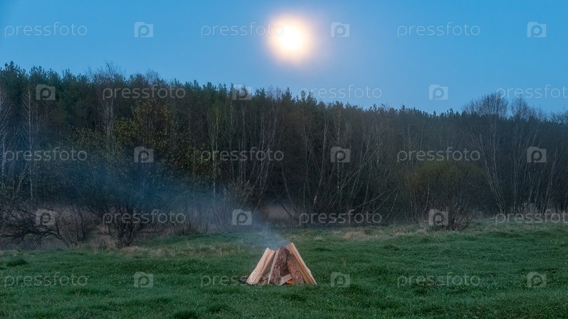 Костер в поле на фоне луны