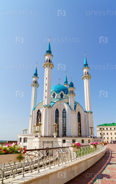 Казань, Россия. Мечеть Кул Шариф. Мечеть на территории Казанского Кремля с голубыми минаретами и куполом