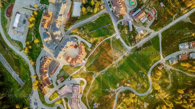 Плато Роза Хутор, постройки, склоны и кресельные подъемники. Вид с воздуха на закате