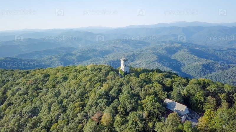 Гора с башней, покрытая лесом. Гора Ахун, Сочи, Россия