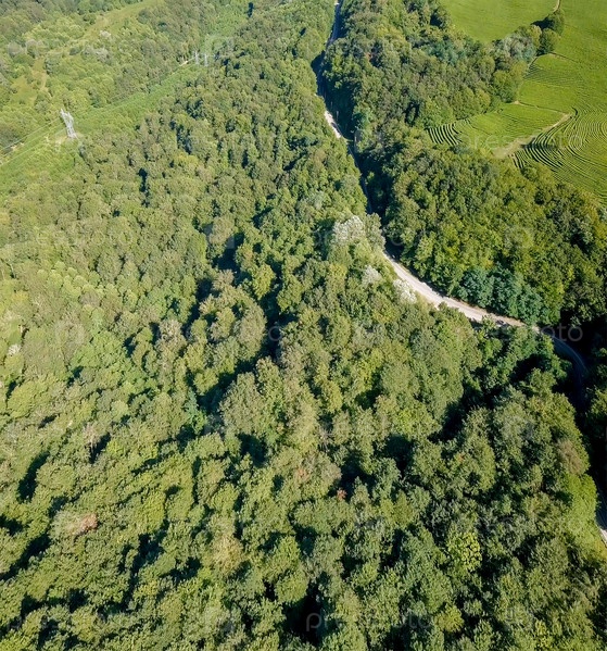 Горы покрыты лесом. И чайная плантация. Посередине извилистая асфальтированная дорога. Сочи, Россия