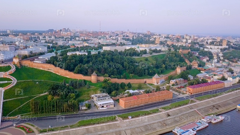 Вид на Нижегородский Кремль и Чкаловскую лестницу. Во время восхода солнца. Нижний Новгород, Россия