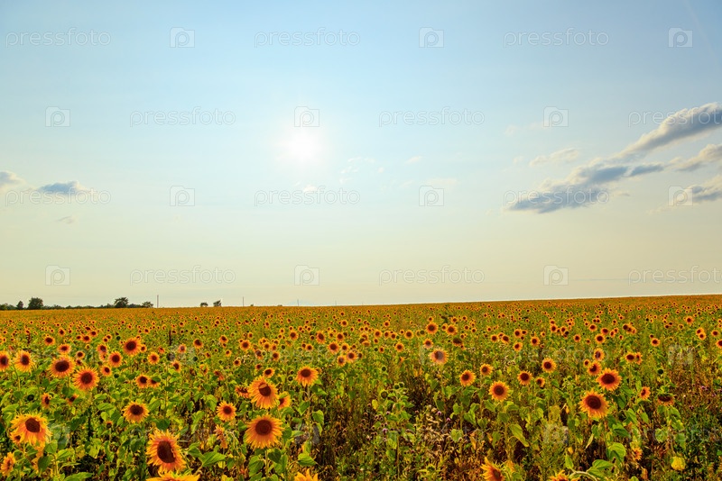 Поле подсолнухов в солнечную погоду. HDR, освещение