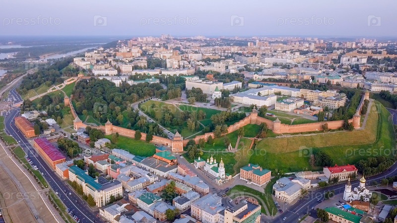 Вид с воздуха на Нижегородский Кремль со стороны реки во время заката. Нижний Новгород, Россия