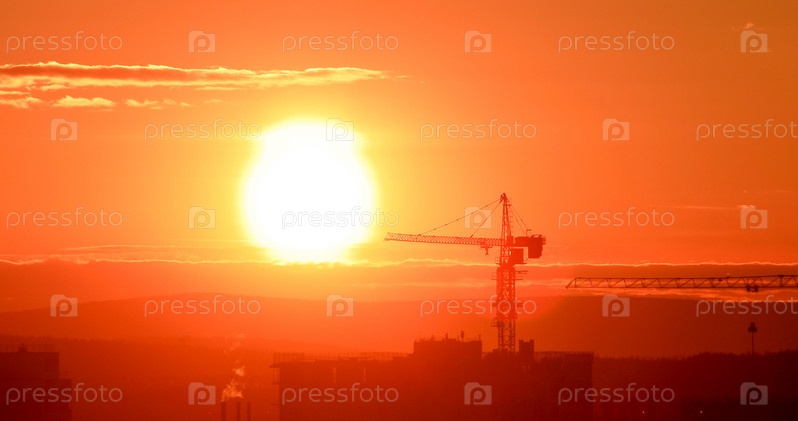 Башенный кран на фоне заходящего солнца. Подсветка. Екатеринбург, Россия