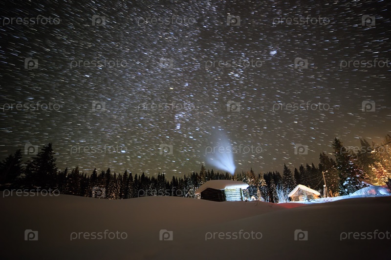 Маленький домик на фоне звездного неба зимой. Оставлять следы в виде линий