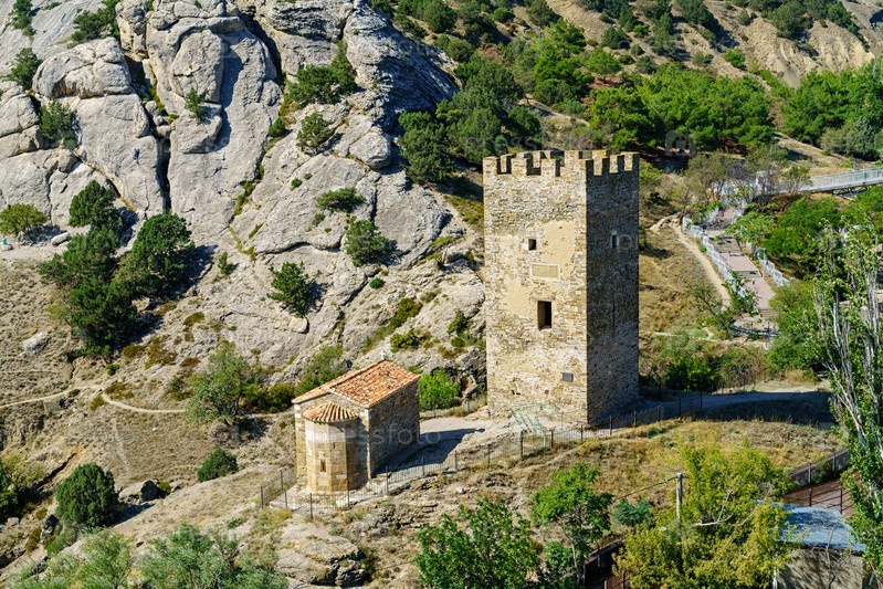 Судак, Крым. Башня Фредерико Астагвера, 1386 г. Генуэзская крепость. Солнечная погода. Черноморское побережье