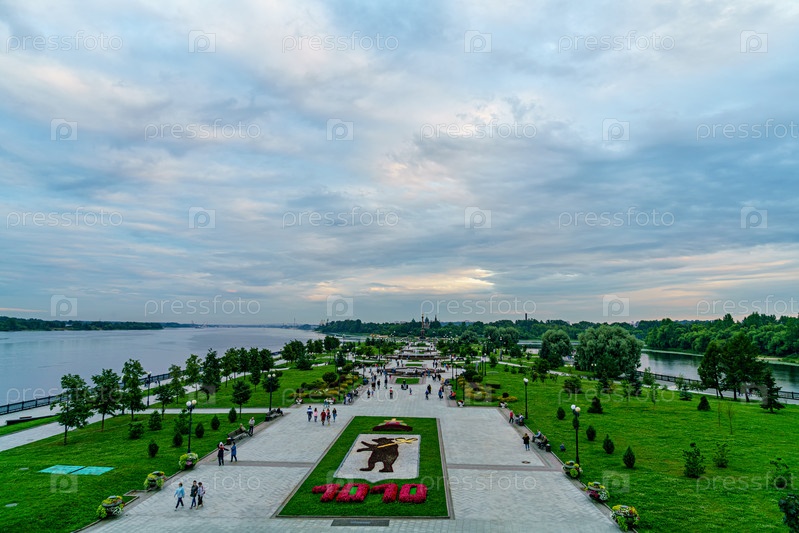 Ярославль, Россия. Паркуйтесь по стрелкам. Государственный герб города Ярославля. Место впадения реки Которосль в Волгу