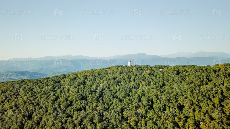 Гора с башней, покрытая лесом. Гора Ахун, Сочи, Россия