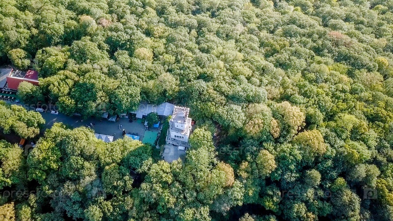 Гора с башней, покрытая лесом. Гора Ахун, Сочи, Россия. Текст на английском, написанный на асфальте - Ахун