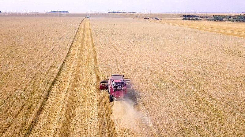 Зерноуборочный комбайн собирает пшеницу на поле