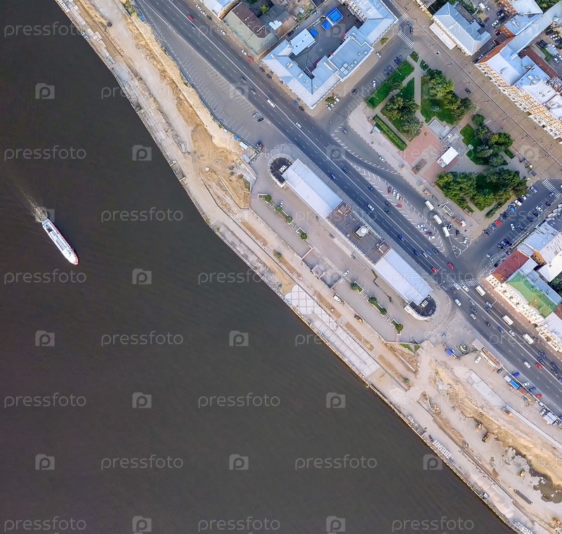 Речной вокзал Нижнего Новгорода во время заката. Аэрофотоснимок сверху. Нижний Новгород, Россия