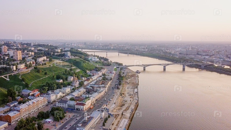 Вид с воздуха на Канавинский мост через Оку со стороны реки во время заката. Нижний Новгород, Россия