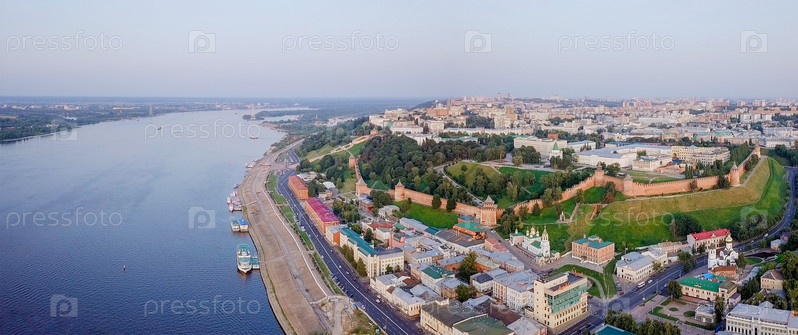 Вид с воздуха на Нижегородский Кремль со стороны реки во время заката. Нижний Новгород, Россия