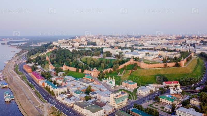 Вид с воздуха на Нижегородский Кремль со стороны реки во время заката. Нижний Новгород, Россия