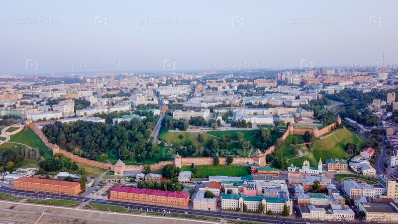 Вид с воздуха на Нижегородский Кремль со стороны реки во время заката. Нижний Новгород, Россия