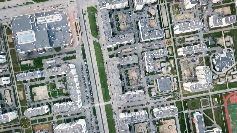 Городского развития. Жилой массив Академический. Россия. Екатеринбург. Съемка с воздуха летающей камерой. ВЫСТРЕЛ В ГОЛОВУ