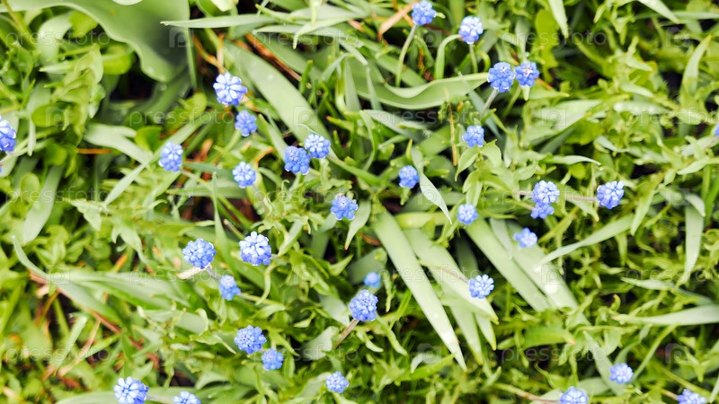 Голубые цветы мускари на зеленом фоне