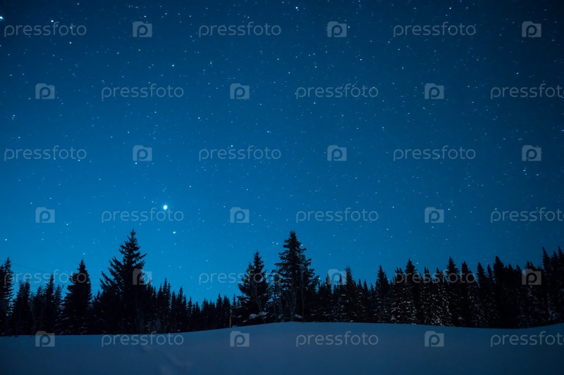 Рождественские елки на фоне звездного зимнего неба. До восхода луны