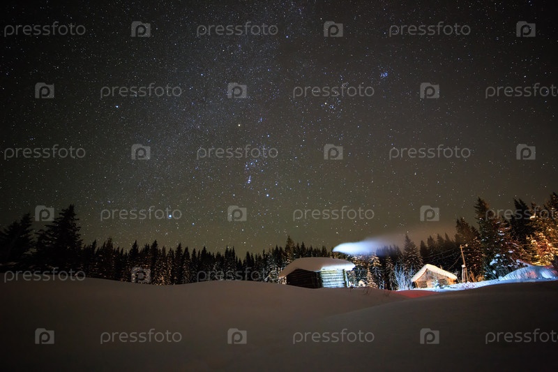 Маленький домик на фоне звездного зимнего неба