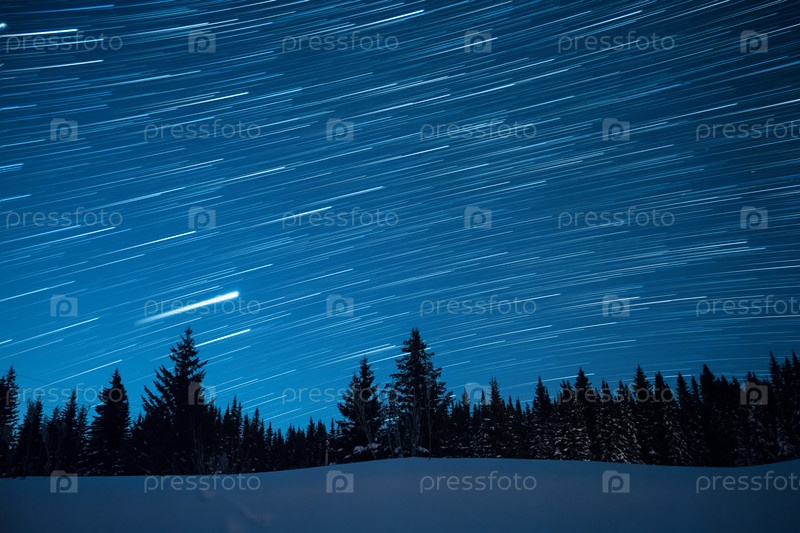 Звездное небо на фоне елей. Оставлять следы в виде линий