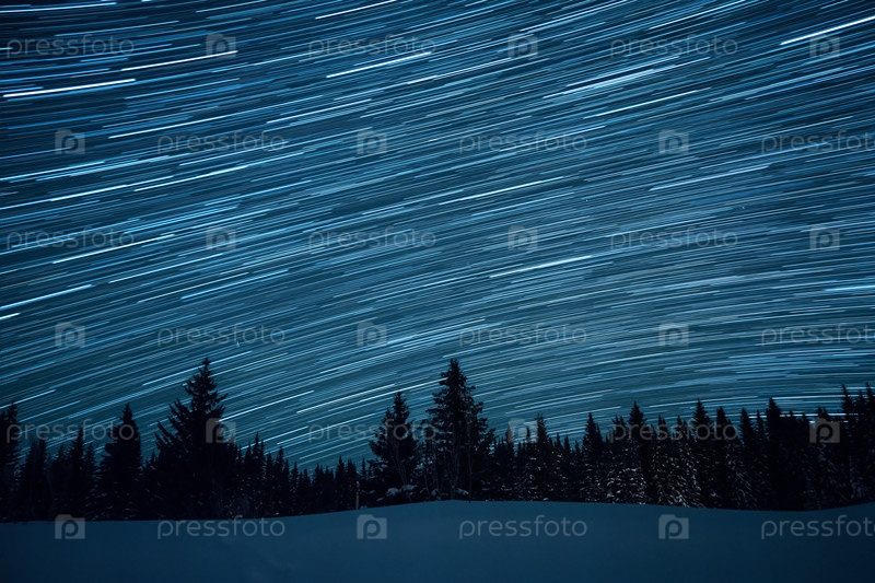 Звездное небо на фоне елей. Оставлять следы в виде линий