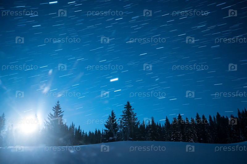 Звездное небо на фоне елей. Восход луны. Оставлять следы в виде линий