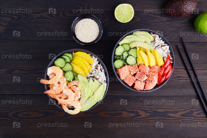 Чаша с креветками, лососем, авокадо, рисом, огурцом, манго, перцем и кунжутом, соевым соусом на сером фоне