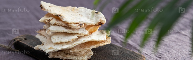 Домашняя маца с микрозеленым горошком. Бездрожжевой лепешка. Концепция празднования Песах. Еврейская Пасха фон. Пита