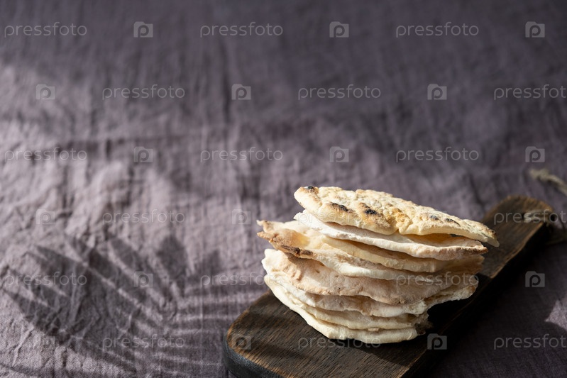 Домашняя маца с микрозеленым горошком. Бездрожжевой лепешка. Концепция празднования Песах. Еврейская Пасха фон. Пита