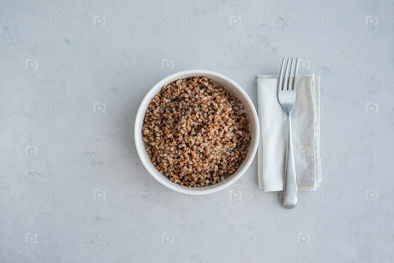 Миска гречки на сером бетонном фоне в минималистичном стиле. Концепция сбалансированного питания и здоровой пищи. Вид сверху. Здоровая вегетарианская еда на сером кухонном столе, пространство для копирования, выборочный фокус