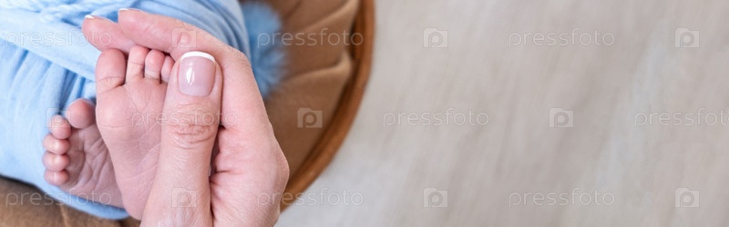 Баннер. Ноги новорожденного. Концепция материнства. День матери. Скопируйте пространство. Ноги новорожденного. Концепция материнства. День матери. Скопируйте пространство