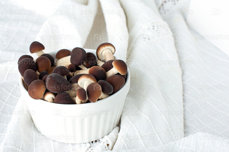 Грибы, опята в тарелке, на мешковине. Копировать пространство
