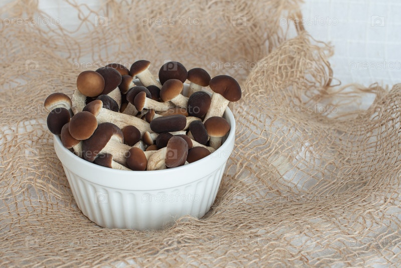Грибы, опята в тарелке, на мешковине. Копировать пространство