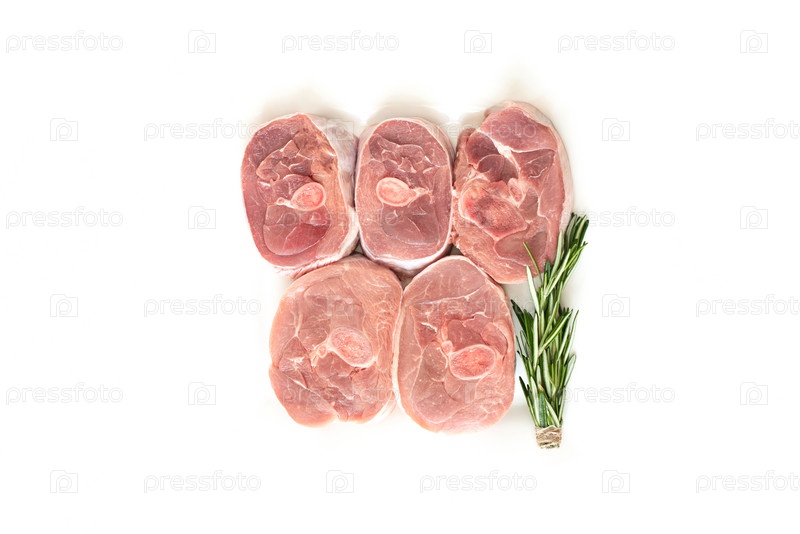 Кусочки сырого мяса индейки, рубленый стейк из ножек, порционные кусочки барбекю, белый фон с веточкой розмарина, изолят