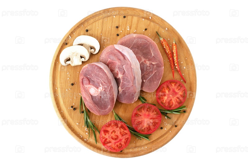 Кусочки сырого мяса индейки, нарезанный стейк из ноги, порционные кусочки барбекю, на круглой деревянной доске и на белом фоне с веточкой розмарина, помидорами и красным острым перцем. изолировать